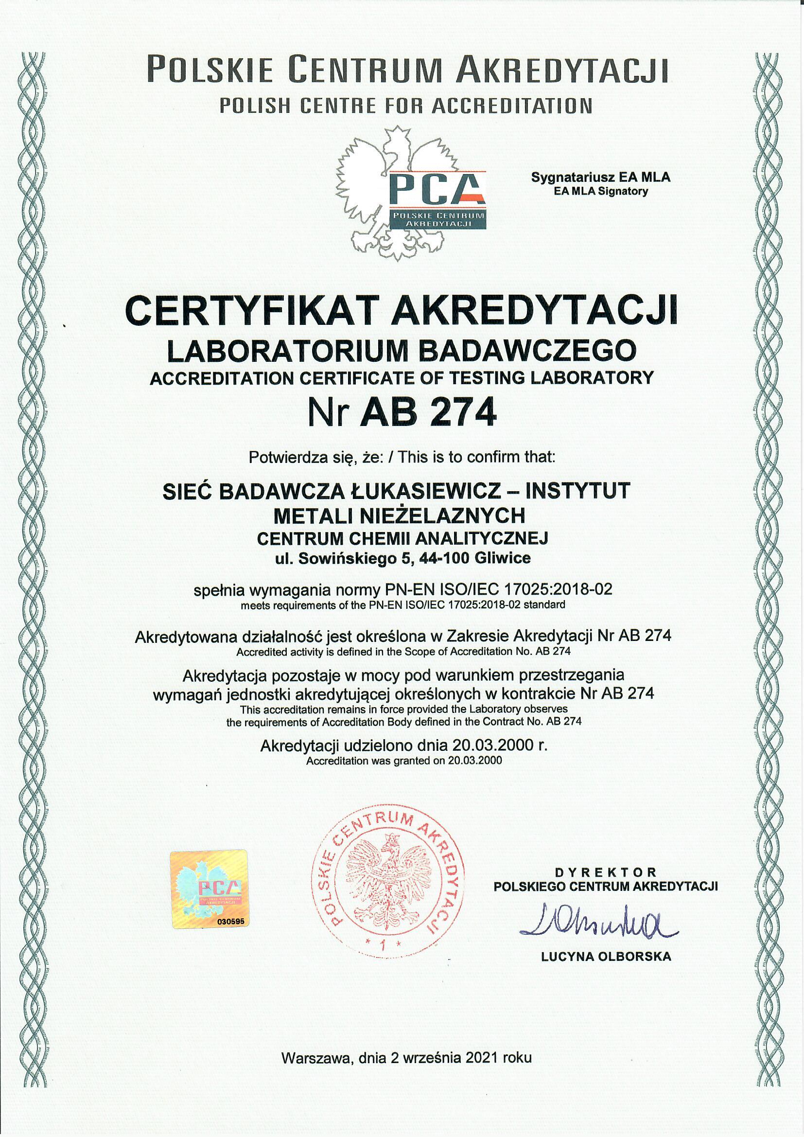 Centrum Chemii Analitycznej posiada akredytację, wydaną przez Polskie Centrum Akredytacji, na zgodność z: