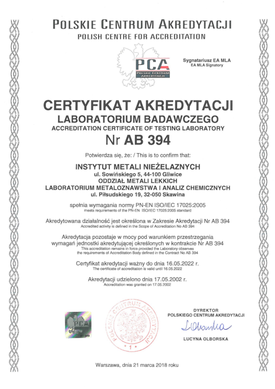 Badania wykonywane są zgodnie z wymaganiami aktualnych norm, procedurami własnymi oraz z wymogami systemu jakości w akredytowanym Laboratorium Metaloznawstwa i Analiz Chemicznych IMN (certyfikat PCA nr AB 394).